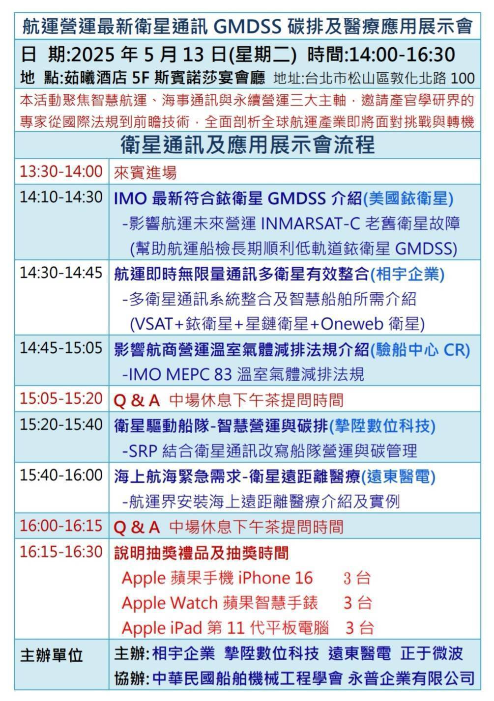 敬邀報名參加5/13(二)航運營運衛星通訊應用(GMDSS碳排管理遠距離醫療解決方案)展示會
